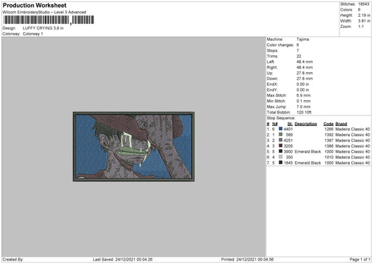 Monkey D Luffy crying Embroidery Design Files - 4 Size's