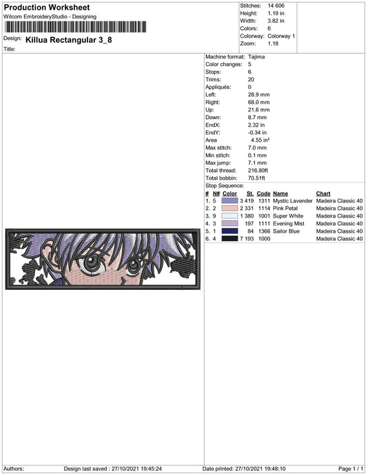 Killua Zoldyck Rectangle Embroidery Design Files - 5 Size's