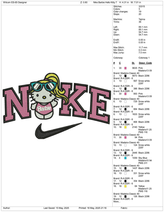 Nike Hello Kitty Barbie Embroidery Design Files - 3 Size's