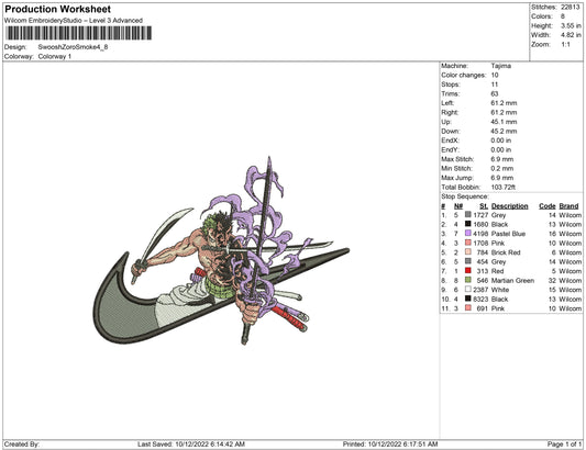 Roronoa Zoro Swoosh v6 Embroidery Design Files - 4 Size'sPrecio habitual $6.99 USDPrecio habitualPrecio unitario / por-