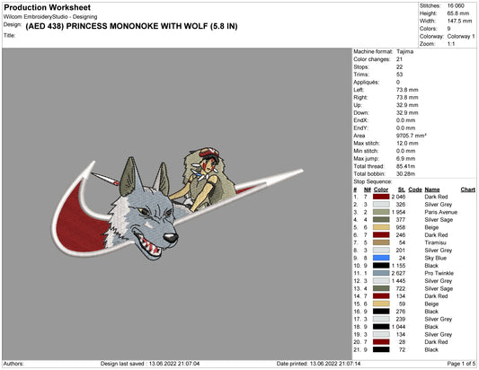 Princess Mononoke With Wolf Embroidery Design Files - 4 Size's