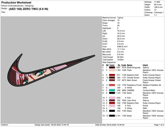 Zero Two Swoosh Embroidery Design Files - 4 Size's