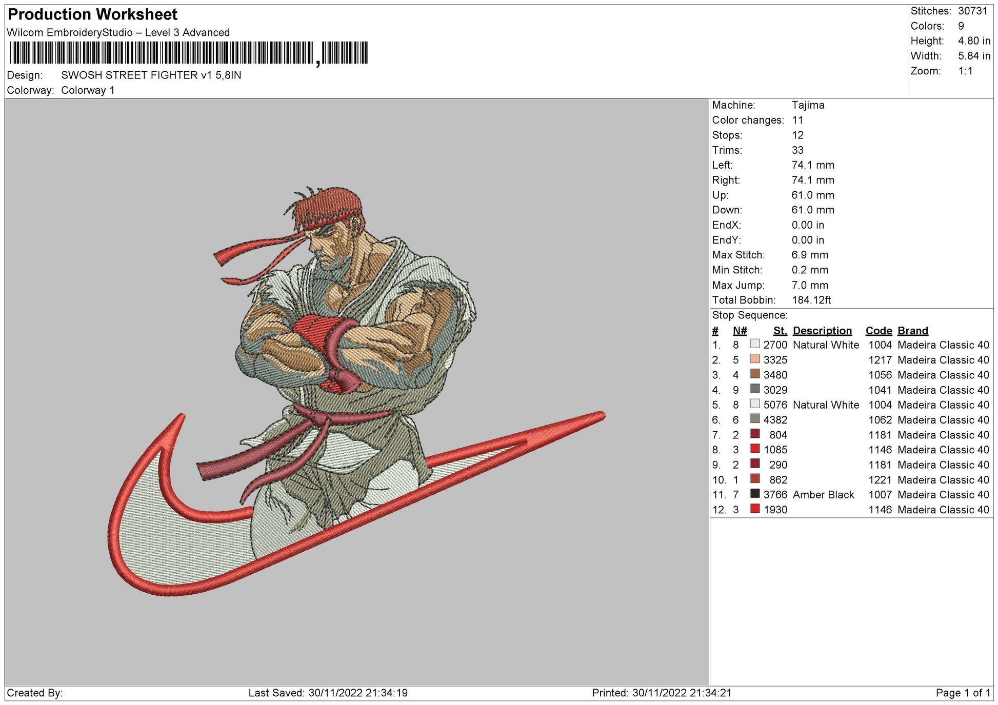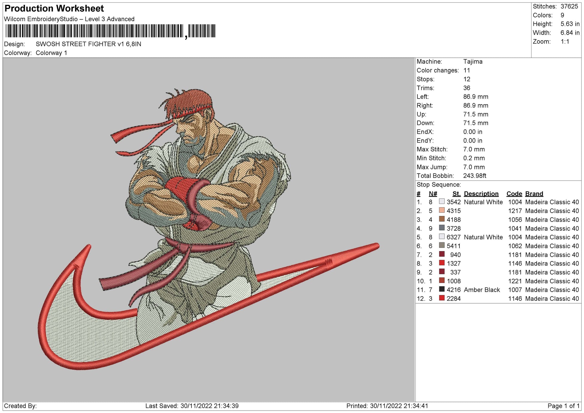 Ryu Street Fighter Swoosh Embroidery Design Files - 5 Size's