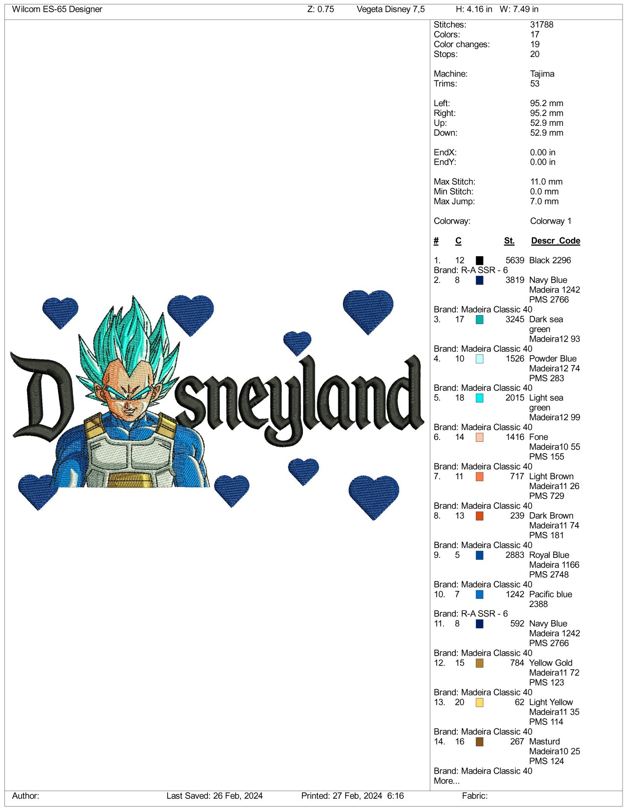 Archivos de diseño de bordado de Vegeta Disneyland - 3 tamaños