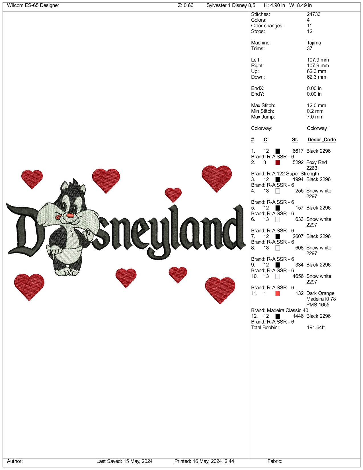 Baby Sylvester Disneyland Embroidery Design Files - 3 Size's