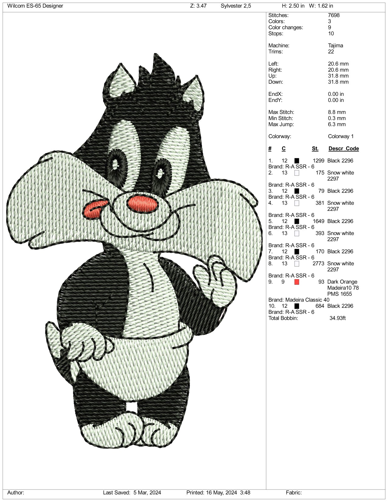 Baby Sylvester Embroidery Design Files - 3 Size's