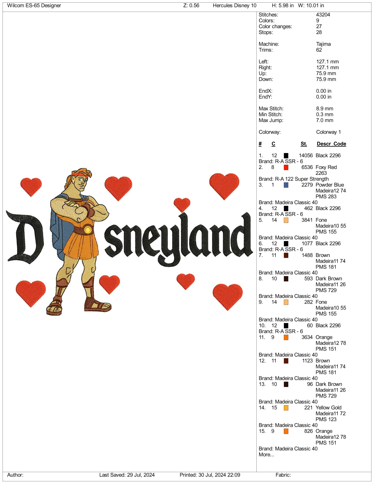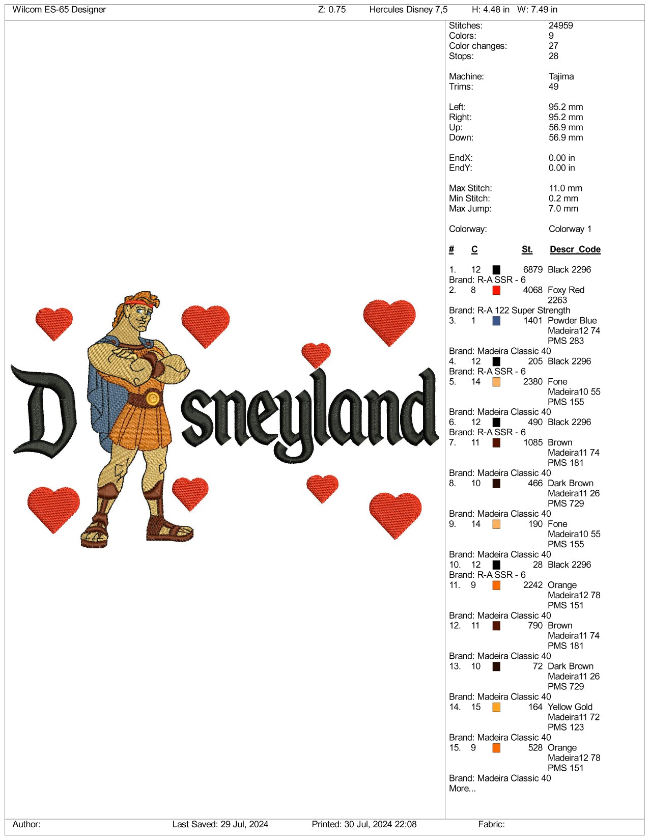Hercules Disneyland Embroidery Design Files - 3 Size's
