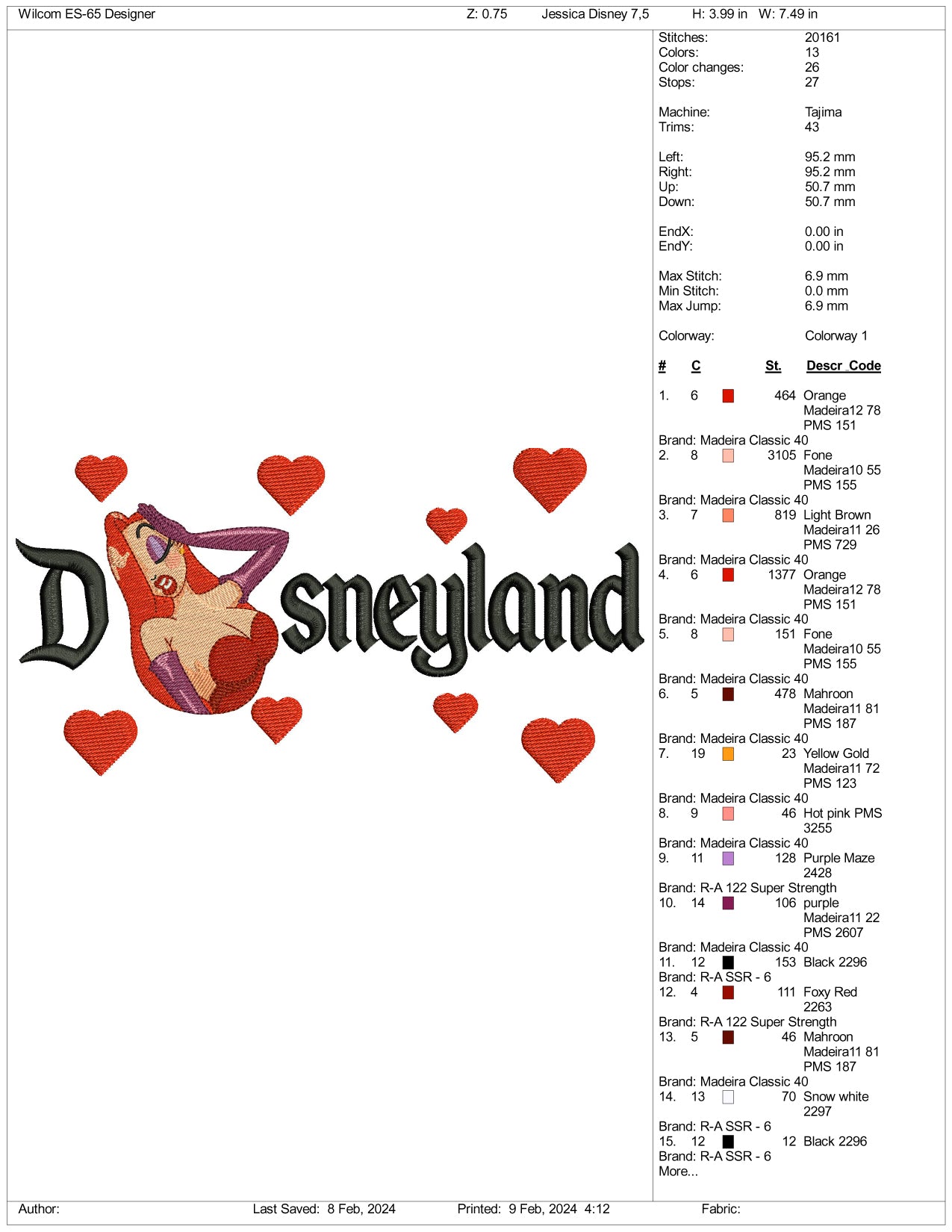 Jessica Rabbit Disneyland Embroidery Design Files - 3 Size's
