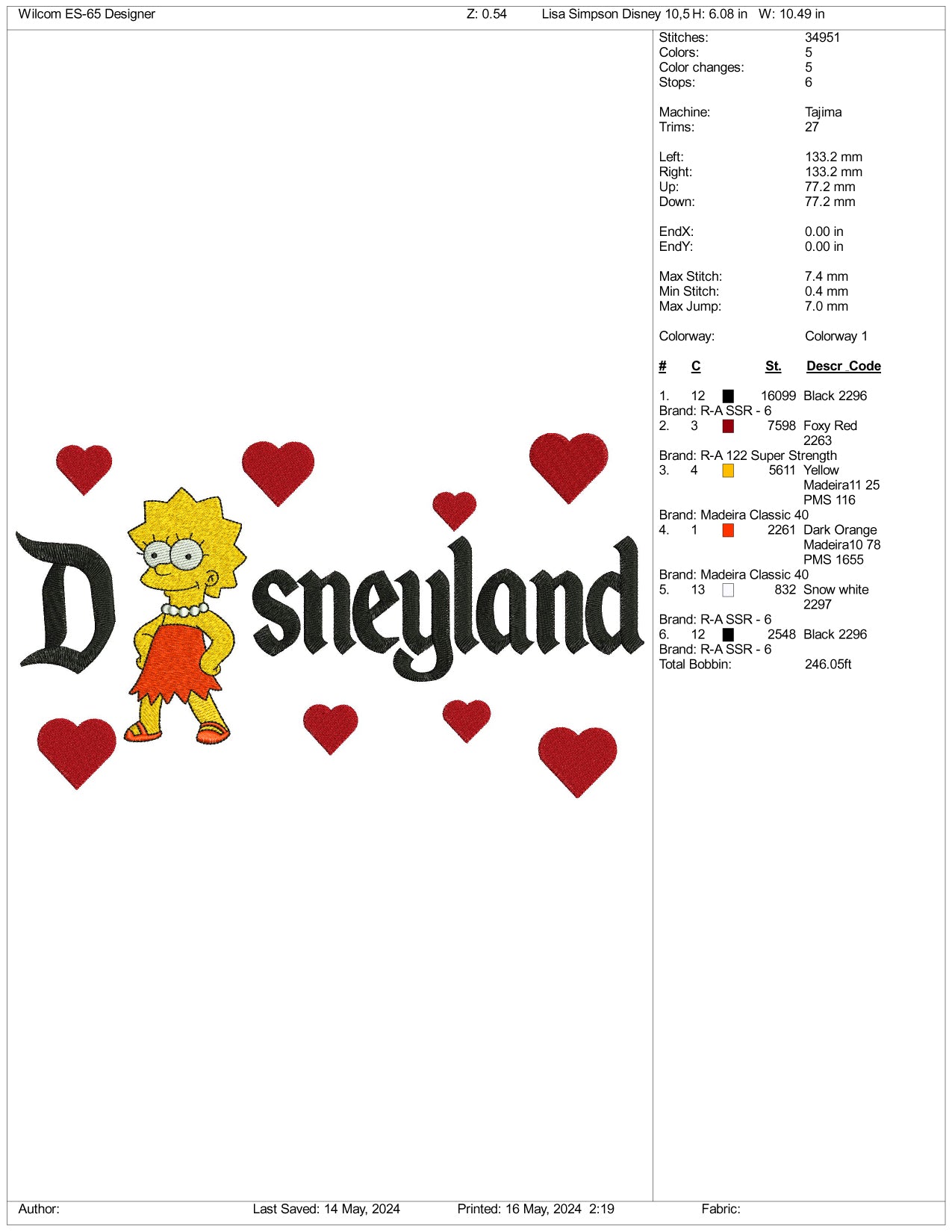 Lisa Simpson Disneyland Embroidery Design Files - 3 Sizes