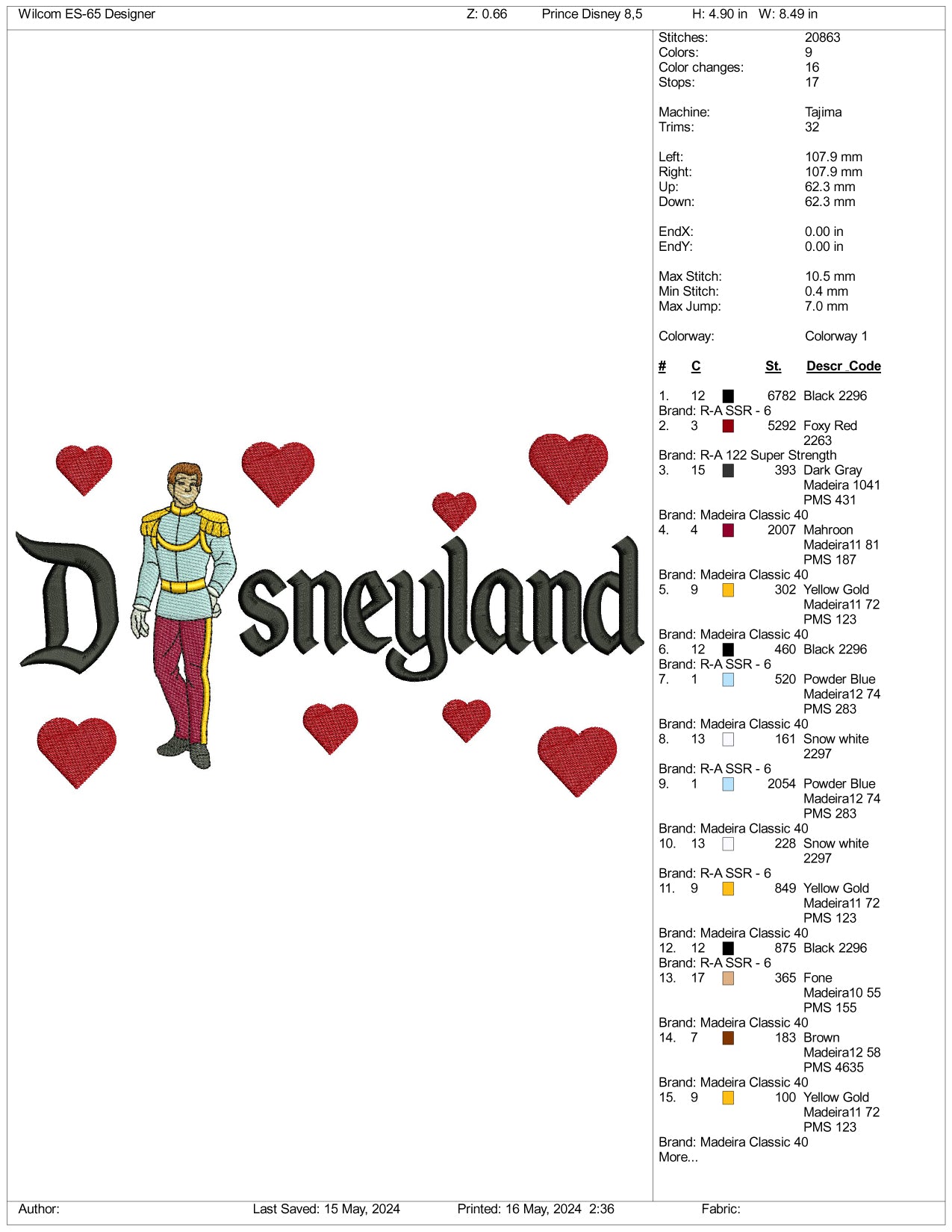 Prince Charming Disneyland Embroidery Design Files - 3 Sizes